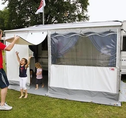 The Caravanstore is great for short holidays and weekend trips away. Its ideal use is in fair weather, as it provides shade and shelter from the occasional shower. It can be put up and taken down in a few moments, a lot faster than traditional full or porch awnings. With the Caravanstore Sip you can double your living space and bring in more light through its large windows. The Caravanstore Zip is built around the original Caravanstore but with the inclusion of two YKK zips sewn into the outer vinyl roof fabric, which zip to the Privacy Room side panels. Side panels are suported by the use of two telescopic aluminium roof rafters, which also incorporate two tensing legs for additional support. The front panel is supported by a ‘C’ channel and has an independent doorway, which can be installed to the left or the right hand side according to personal preference. Finally, the entire front can be rolled up or simply removed. With plenty of pegging points and a deep mudwall for maximum adjustment, the Caravanstore Zip is a great buy for any trip.