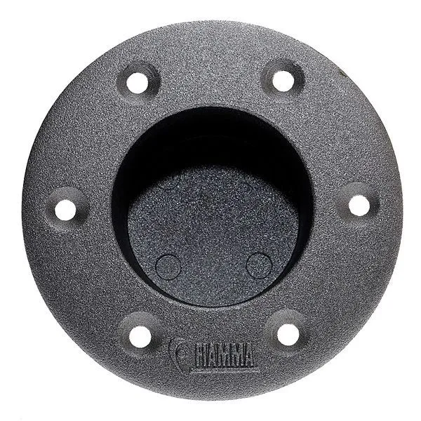 A chrome recessed base with table leg connections made of aluminium, the recessed connection is flush to the floor when fitted into a drilled hollow.