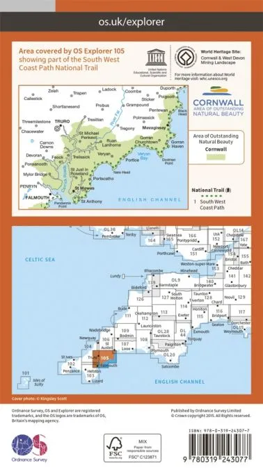 Map sheet number 105 in the OS Explorer map series is the ideal map for walks, hikes and rides around Falmouth, Mevagissey, Truro and St Mawes. The South West Coast Path is an ideal way to explore the coastline in this part of Cornwall. Highlights of the area include: Pendennis Point, Lost Gardens of Heligan, Mevagissey, Veryan Bay, and Falmouth Bay.
