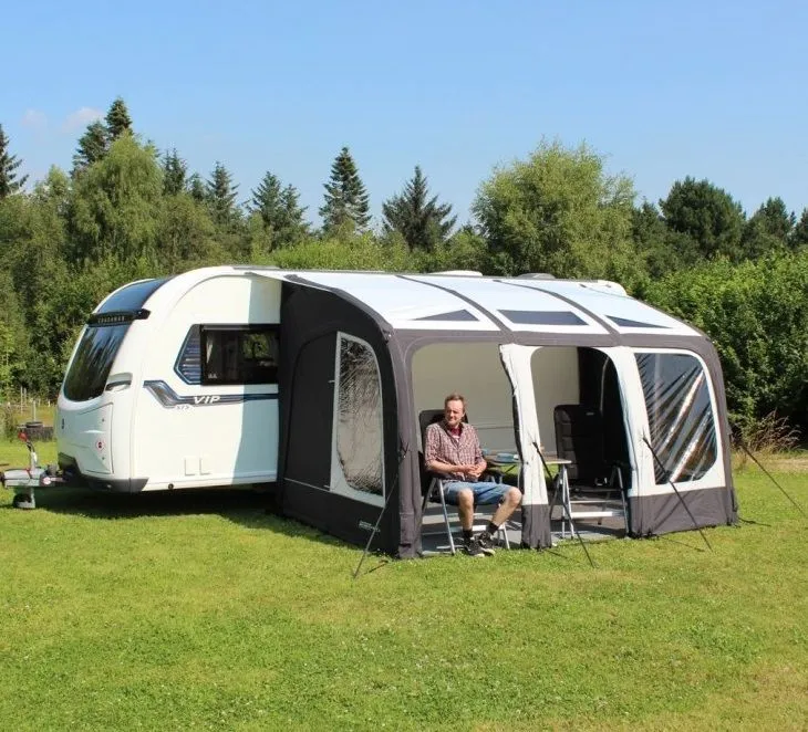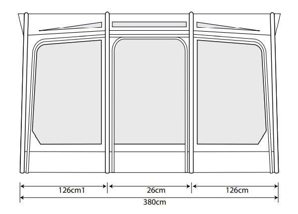 This awning attaches to vehicles that attach between 250 – 265cm, therefore it’s suitable for high-fitting caravans. It will also fit onto motorhomes in this attaching height range, provided you are happy to leave it pitched for the duration of your stay. This is not a drive-away awning.
