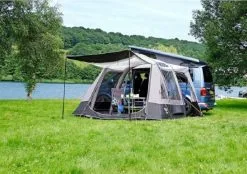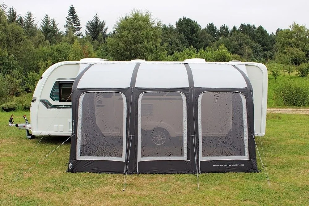Introducing the Outdoor Revolution Sportlite Air 400 awning, a high-performance inflatable Caravan Porch Awning designed by caravanners, for caravanners, with functionality and practicality in mind. Inflated from a single point and deflated from 2, this awning goes up and down in minutes making it perfect for touring enthusiasts, and the robust yet lightweight nature of the 280HDE polyester fabric makes it extremely manageable to pack and transport. Offering plentiful living space and the option to zip a bedroom annexe onto either side of the awning, this awning is packed full of features including mesh fly-screen panels on both side doors, zip-up curtains throughout, and three fully roll-back front doors. Designed in the popular width of 400cm and weighing under 22kg the contemporary Sportlite Air 400 offers exceptional value for money, and looks fantastic!
