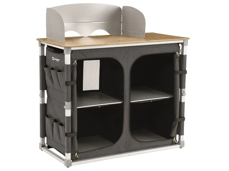 The kitchen table includes a ‘pull-out’ holder for a washing bowl or rubbish bag, and a windshield to protect burner flames.