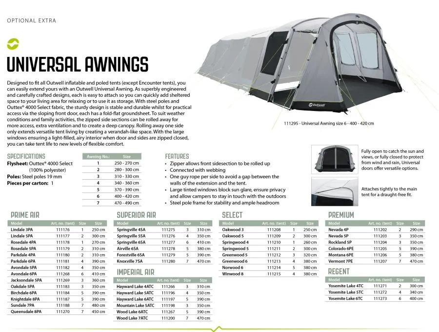 Designed to fit all Outwell inflatable and poled tents (except Encounter tents), you can easily extend yours with an Outwell Universal Awning. As superbly engineered and carefully crafted designs, each is easy to attach so you can quickly add sheltered space to your living area for relaxing or to use it as storage. With steel poles and Outtex® 4000 Select fabric, the sturdy design is stable and durable whilst for practical access via the sloping front door, each has a fold-flat groundsheet.