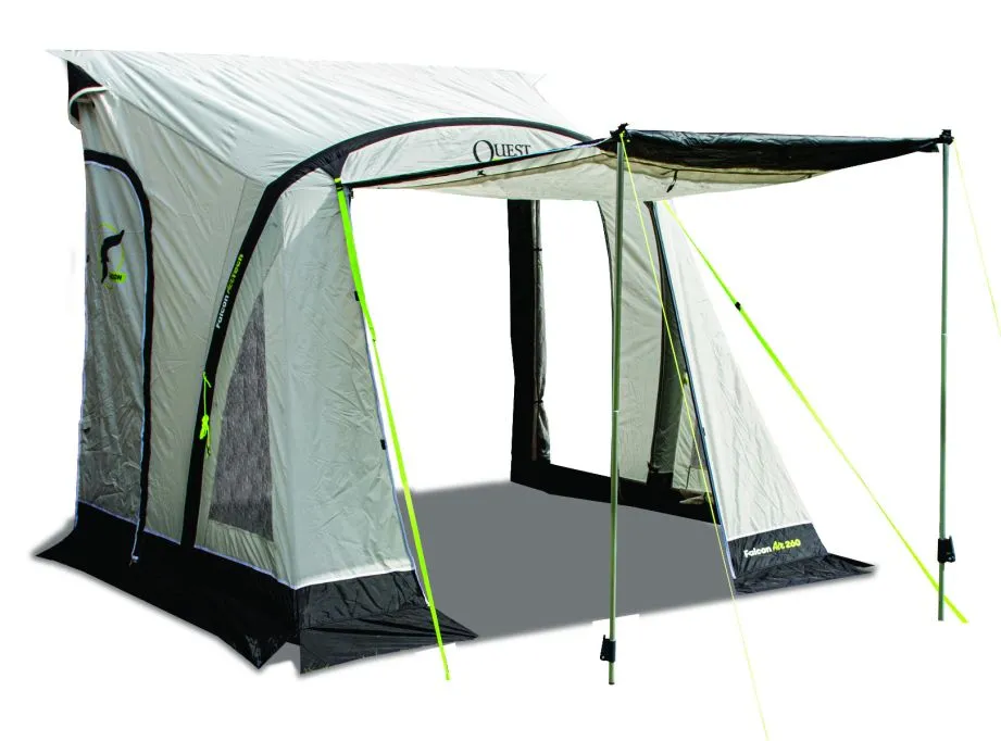 The awning has additional features such as full mesh doors, roll-down, half or full blinds, roll-up front panels, and sun canopy fronts (if used with the optional universal canopy pole kit). All this plus a very small pack size, lightweight and amazing value makes the Falcon an excellent awning for the weekend, first-timers, the budget conscious and just about anyone after an easy-to-use lightweight porch awning.