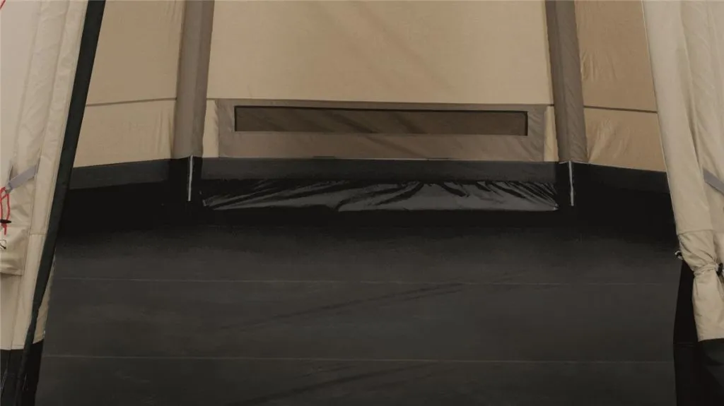 Internal curtains at the windows enhance the impression that this has traditional-style solid HydroTex® Polycotton RS walls yet can be rolled up for views out. The front door has a mesh panel behind and low vents aid airflow.