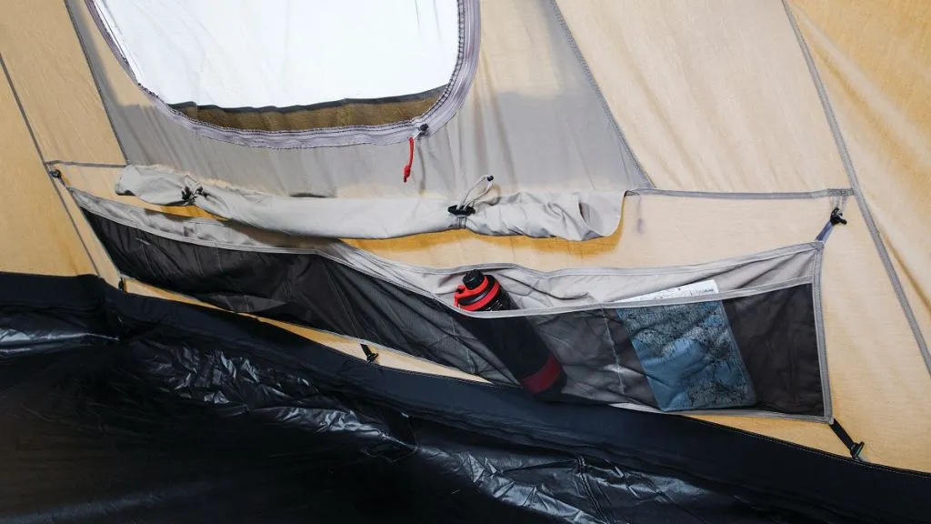 The zip-in groundsheet has a zip to the centre alloy pole, enabling it to be rolled away at the door to create a safe area in which to use the optional stove and place wet gear.